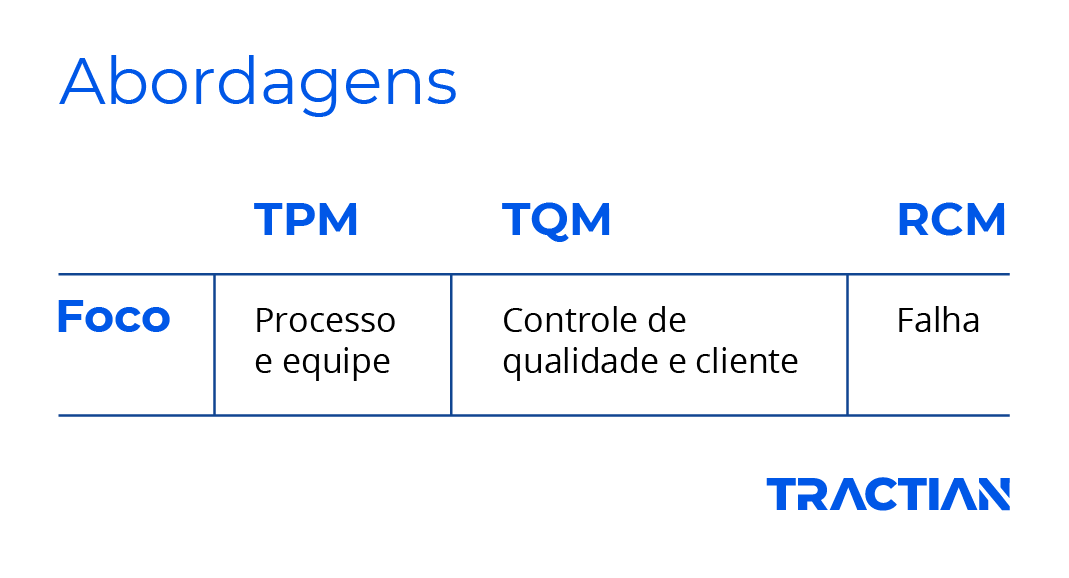 Existem algumas abordagens no mundo da manutenção, cada uma com seu respectivo foco. A TPM (Total Productive Maintenance) se concentra no processo e no pessoal, que engloba gestores, mantenedores, analistas e a equipe como um todo. Com autonomia e uma abordagem científica, é realizada por pessoas treinadas de maneira antecipada.
