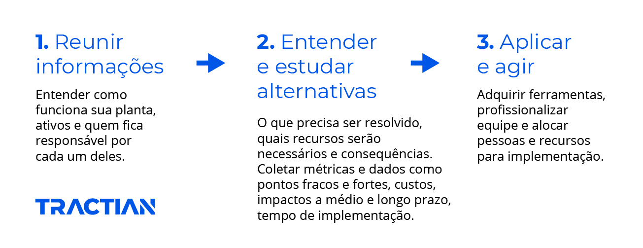 Entender como funciona sua planta, seus setores, linhas e ativos críticos. Além disso, os processos e os responsáveis por cada um deles, ações e eventos.