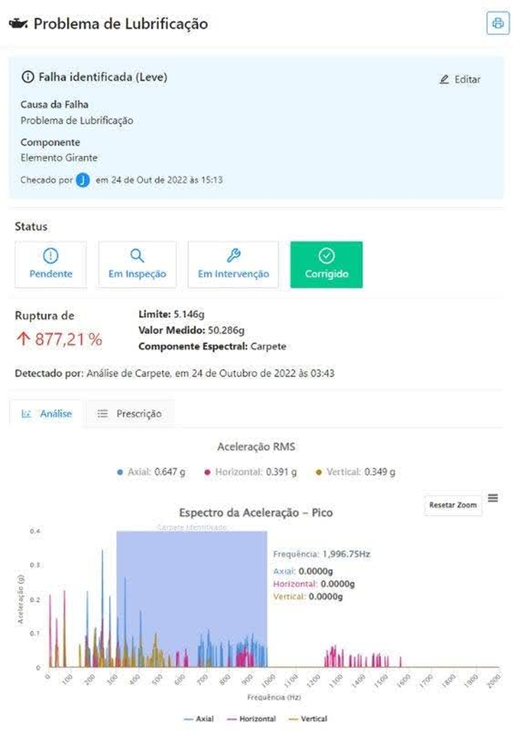 Através da análise de vibração e acompanhamento dos ruídos gerados pelo ativo - como a presença dos famosos “carpetes”, isto é, um ruído (possível de visualizar por meio de gráficos) que se estende a uma região do espectro de vibração -, a tecnologia da TRACTIAN permite identificar prontamente e com mais clareza problemas na lubrificação.
