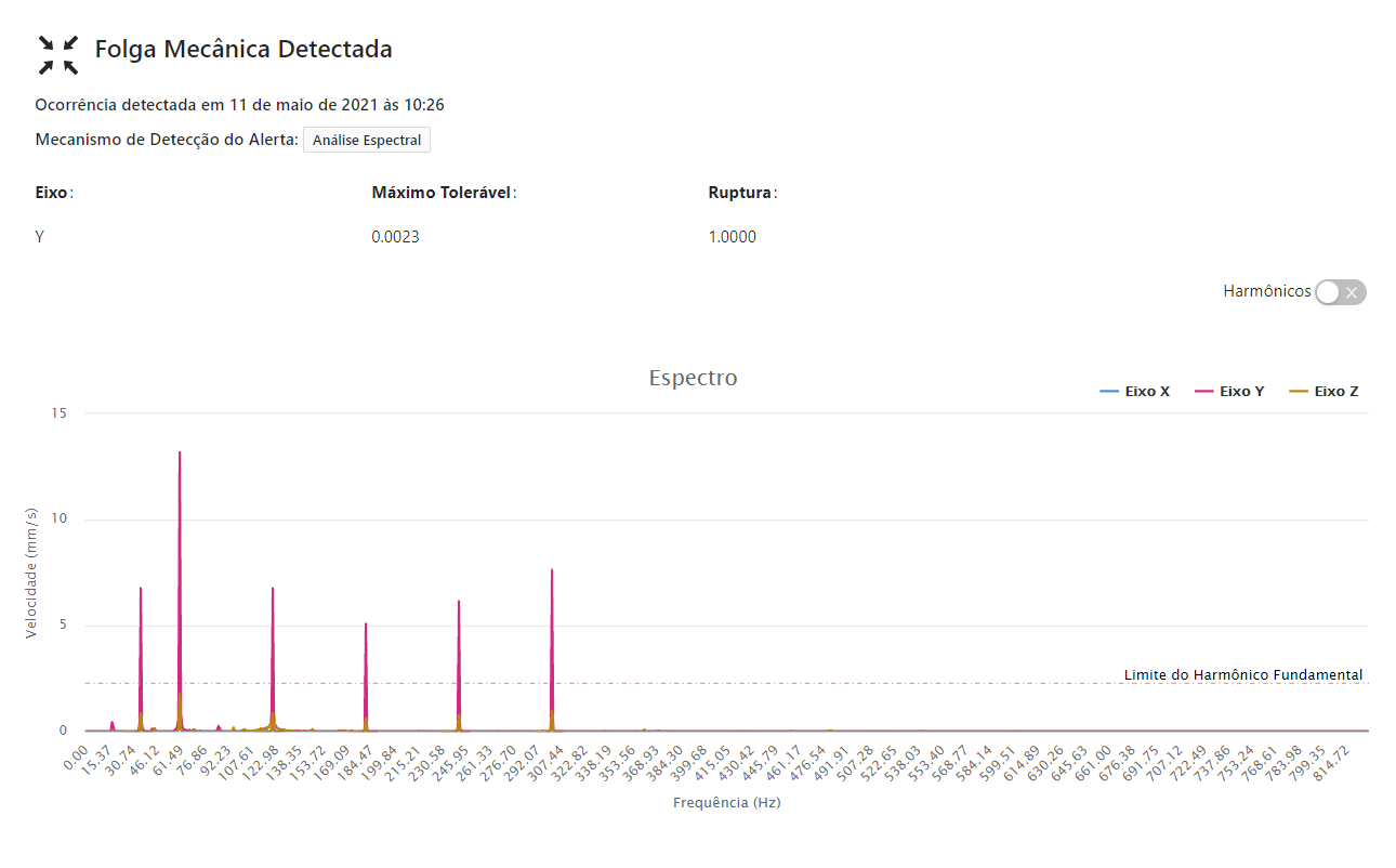 Abaixo, um exemplo de folga mecânica detectada pelo sistema de monitoramento online. Nesse caso, a plataforma identificou anomalias no padrão vibratório do equipamento e alertou o gestor de manutenção.