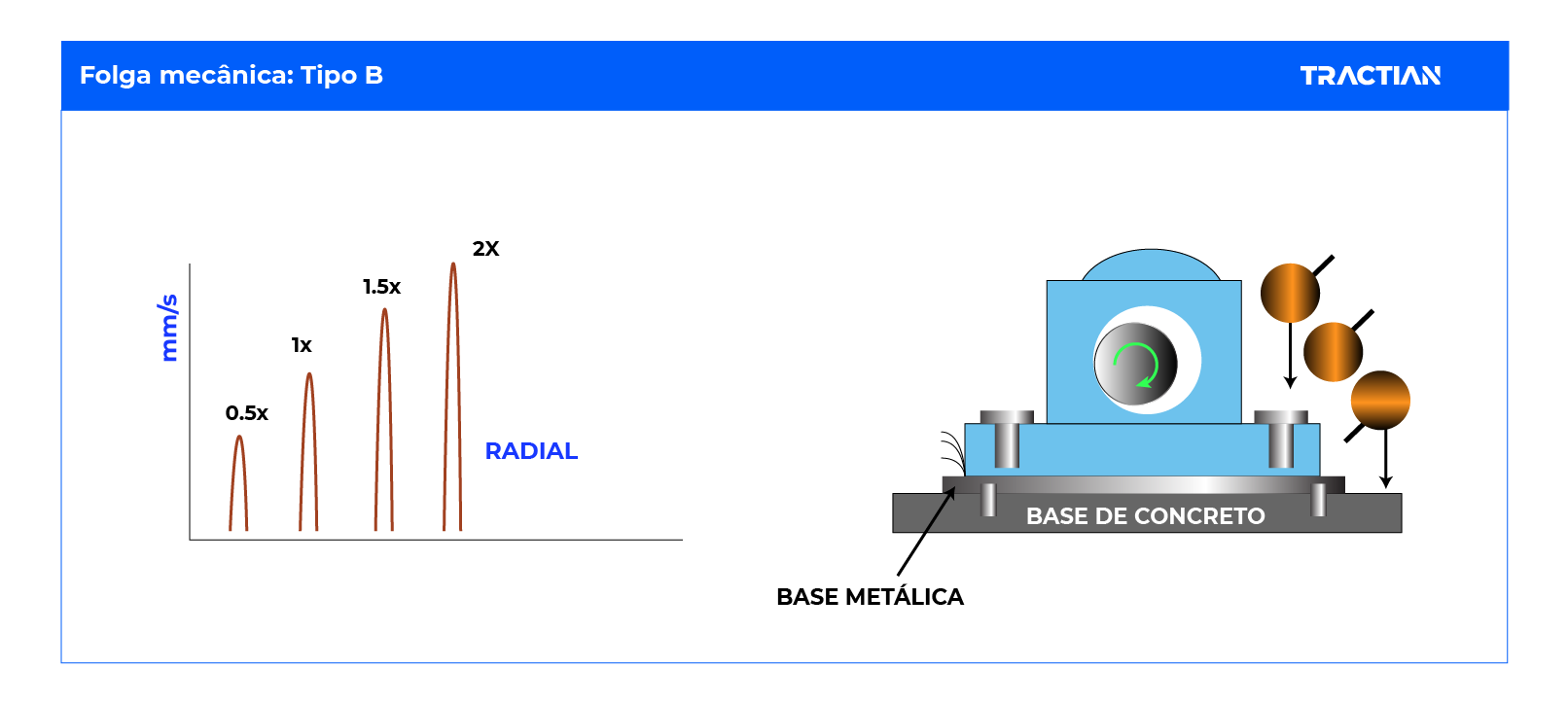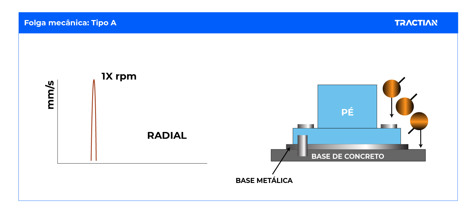 No espectro, o tipo A de folga mecânica aparece como uma onda de um pulso por rotação. A análise revela cerca de 180° graus de diferença de fases entre medições verticais no pé da máquina, onde fica a base.