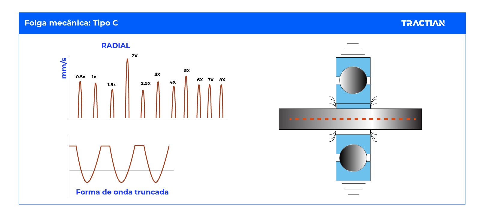Segundo o Manual de Diagnóstico de Vibração da Technical Associates, o tipo C é provavelmente o mais desafiador durante a análise de dados de vibração que envolvem folgas mecânicas, já que sua onda temporal, diferente das ondas dos tipos A e B, apresenta um padrão não repetitivo entre as revoluções. Tal tipo de folga pode originar múltiplos sub-harmônicos capazes de chegar a 10x.