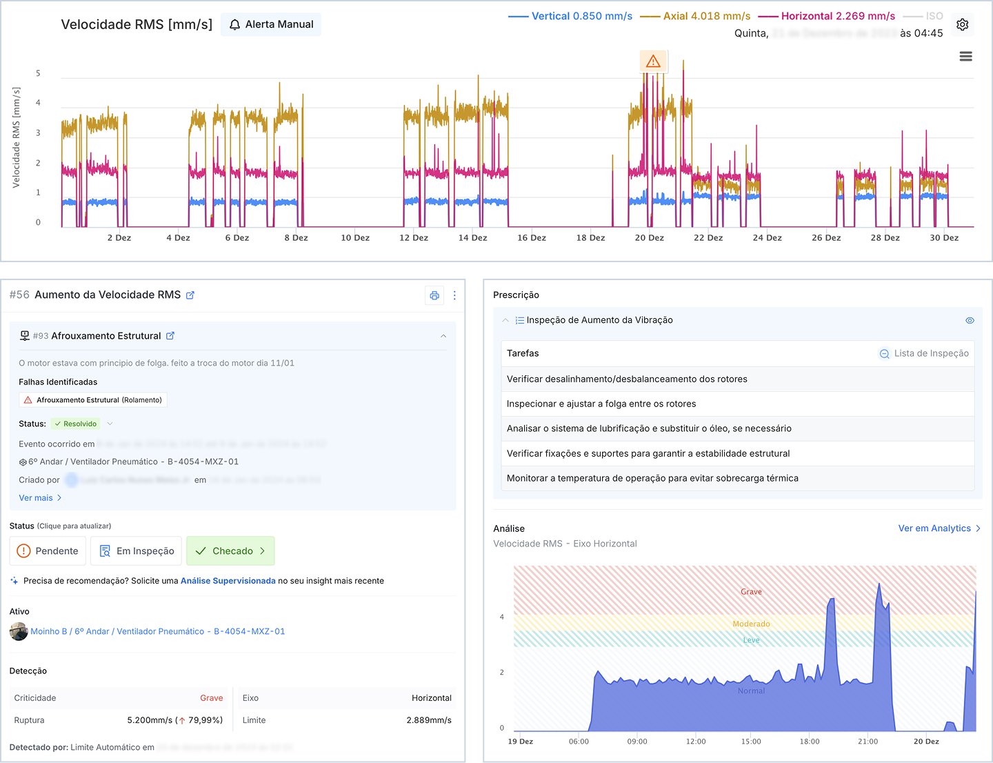 Um alerta da IA indicou um aumento da velocidade RMS de um ventilador pneumático, acionando a equipe de manutenção para uma inspeção imediata. Durante a análise, foi identificado uma possível folga estrutural no rolamento do equipamento.