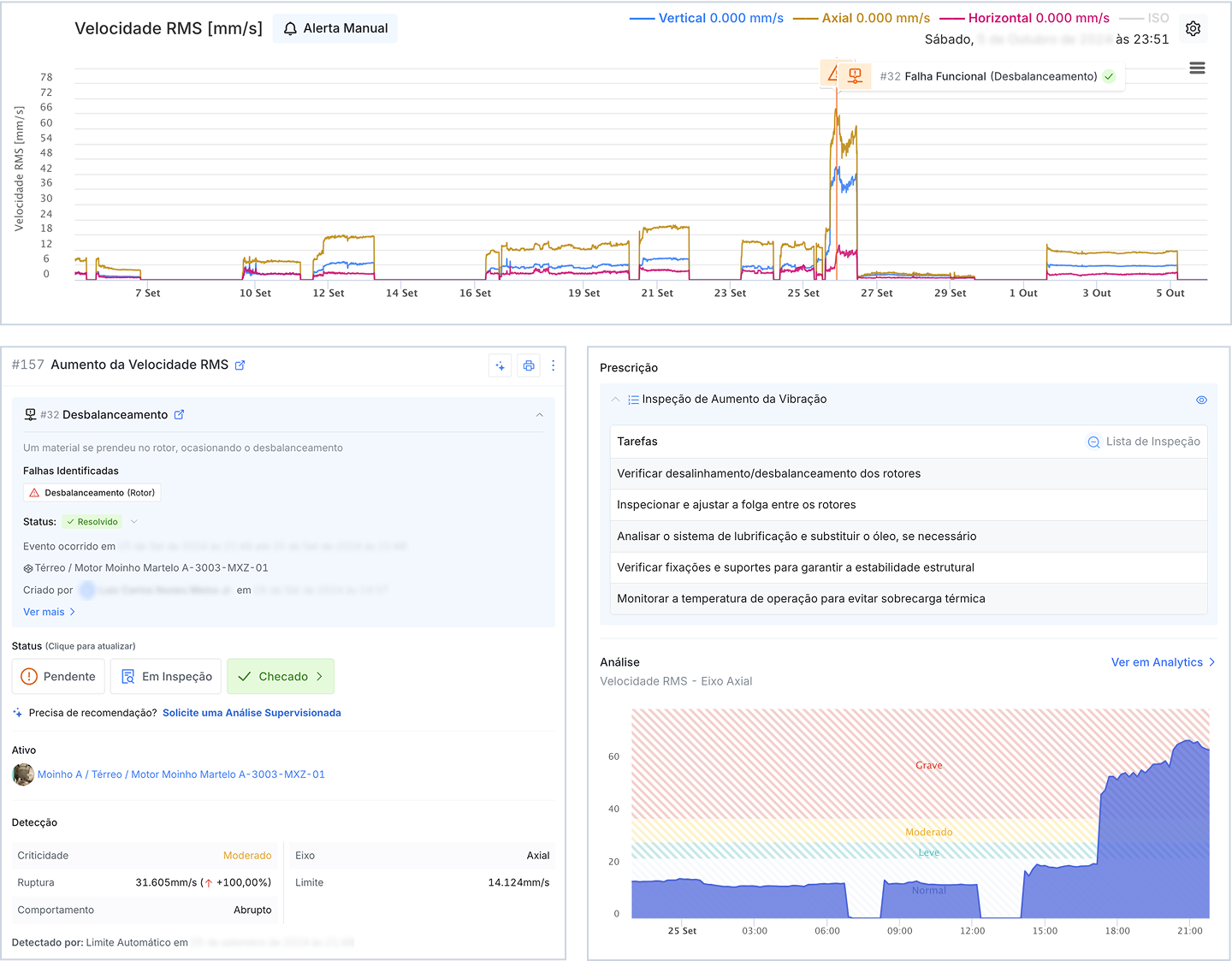 - Alertas preditivos automatizados, com indicação de falhas mecânicas, como desbalanceamentos e afrouxamentos estruturais.
