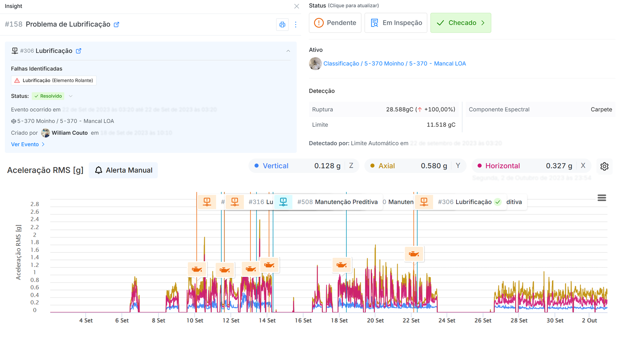 Com a visibilidade proporcionada pelos sensores, a equipe passou a monitorar de forma contínua o comportamento de ativos críticos. No moinho, alertas recorrentes de falha de lubrificação chamaram atenção do time técnico, que revisou o histórico e detectou inconsistências no plano de lubrificação. A investigação revelou inconsistências no plano de lubrificação, que foi então ajustado com base nos padrões reais de operação do ativo. O resultado foi a eliminação das reincidências e o restabelecimento da confiabilidade do equipamento.