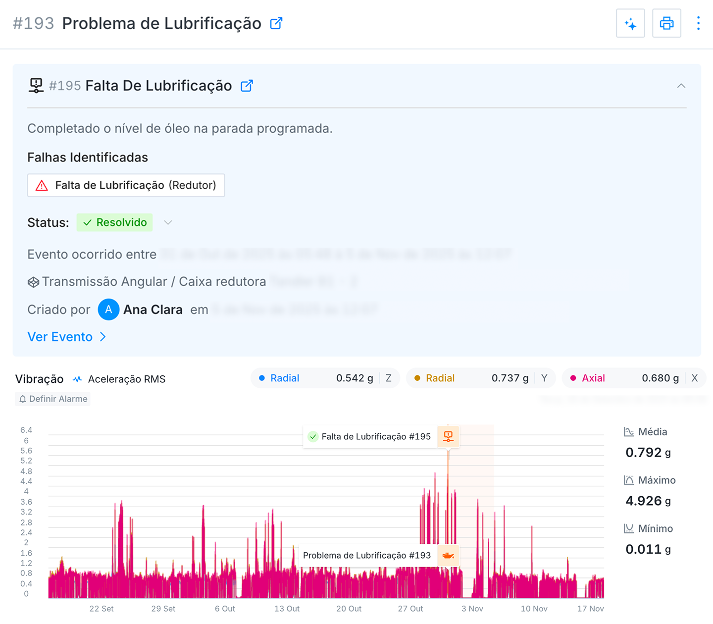Um dos casos mais relevantes envolveu uma caixa redutora em área crítica da planta. A inteligência artificial da Tractian identificou uma anomalia no padrão de vibração e correlacionou o comportamento ao início de deficiência de lubrificação. A equipe técnica realizou a inspeção em campo e confirmou a condição, executando a correção antes que o desgaste evoluísse para uma falha funcional. A atuação antecipada evitou uma parada estimada de 48 horas na máquina, preservando a continuidade da produção e evitando custos significativos com manutenção corretiva.