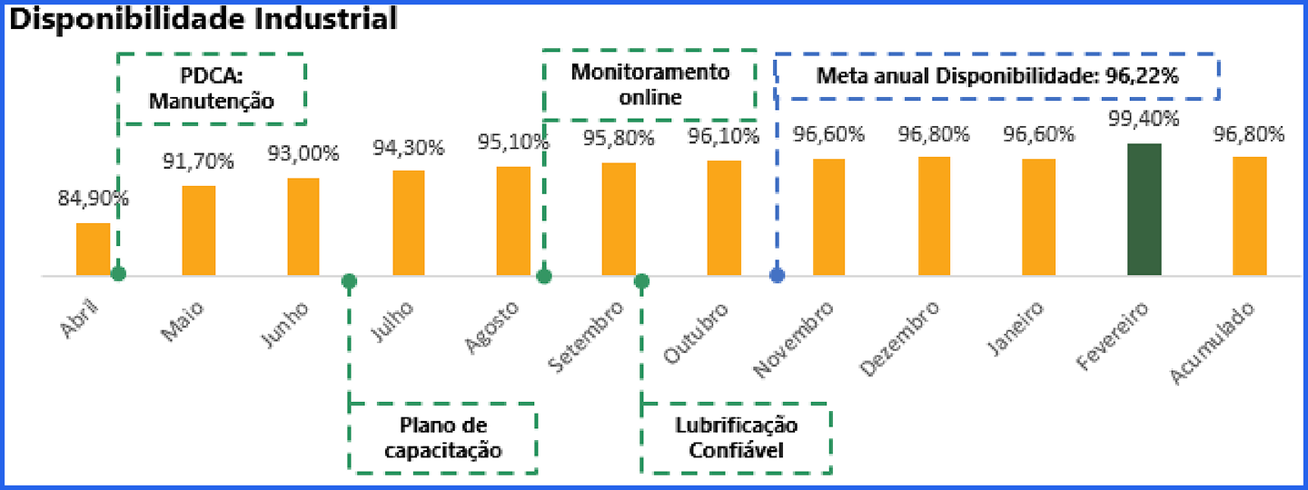 Em paralelo, criou o Centro de Confiabilidade e Gestão de Ativos e uma Sala de Lubrificação 4.0, com estoques estratégicos baseados em criticidade. Mais de 800 horas de capacitação técnica fortaleceram a autonomia e a cultura de confiabilidade da equipe.