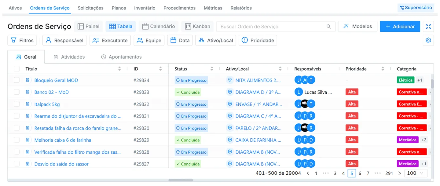 - Criação e acompanhamento de ordens de serviço (preventivas, corretivas e preditivas) de forma estruturada