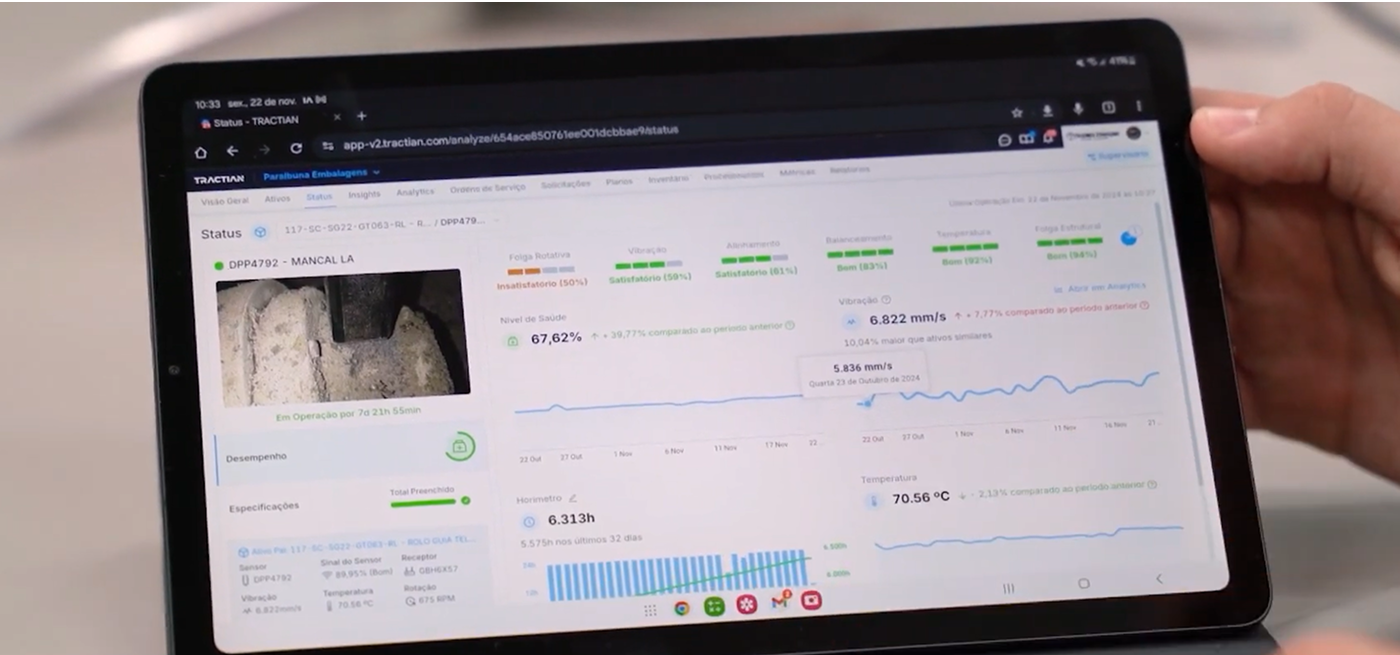 Com os sensores da Tractian, a equipe passou a acompanhar vibração e temperatura continuamente. Alertas chegam de forma automática, permitindo programar intervenções antes da falha.
