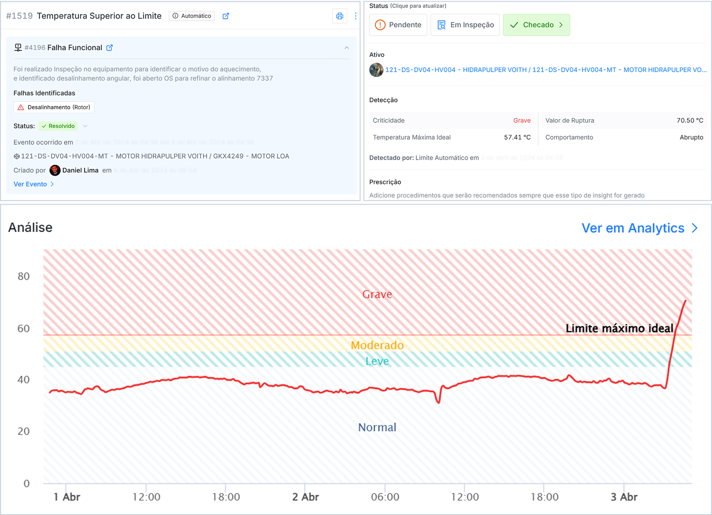 Em outro caso, o sistema identificou uma elevação anormal de temperatura em um motor da linha. A análise preditiva apontou indícios de desalinhamento entre o motor e o redutor, confirmada posteriormente pela inspeção.