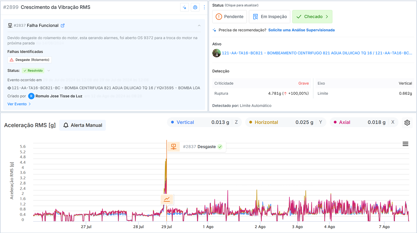 A IA da Tractian detectou vibração crescente em uma bomba crítica. A inspeção confirmou folga e desgaste nos rolamentos. Com intervenção planejada, o time técnico evitou uma parada não programada de 15 horas.