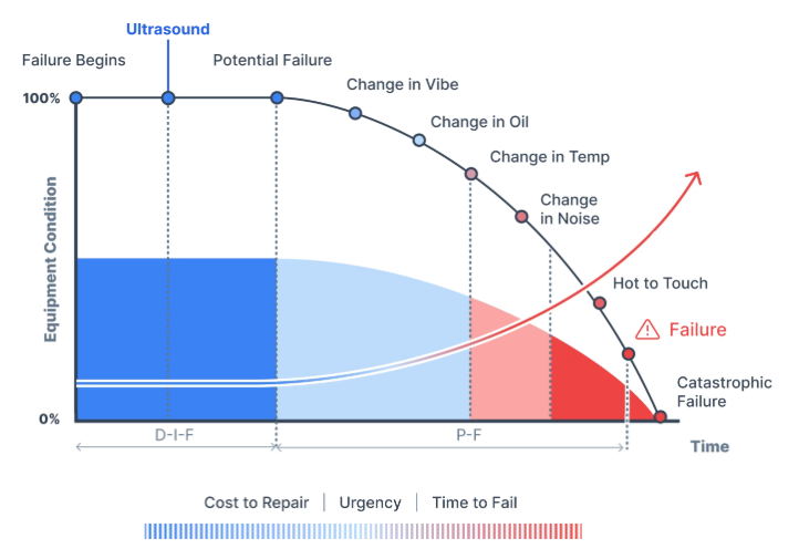 The relationship between ultrasound and vibration analysis is best understood through the P-F curve, the interval between the moment a developing fault first becomes detectable (Potential Failure) and the point at which the asset can no longer perform its function (Functional Failure).