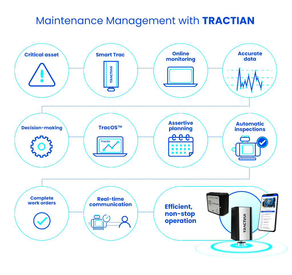 The TRACTIAN predictive system closes and unifies the maintenance cycle: the sensors identify the problem, which is analyzed by the online monitoring platform.