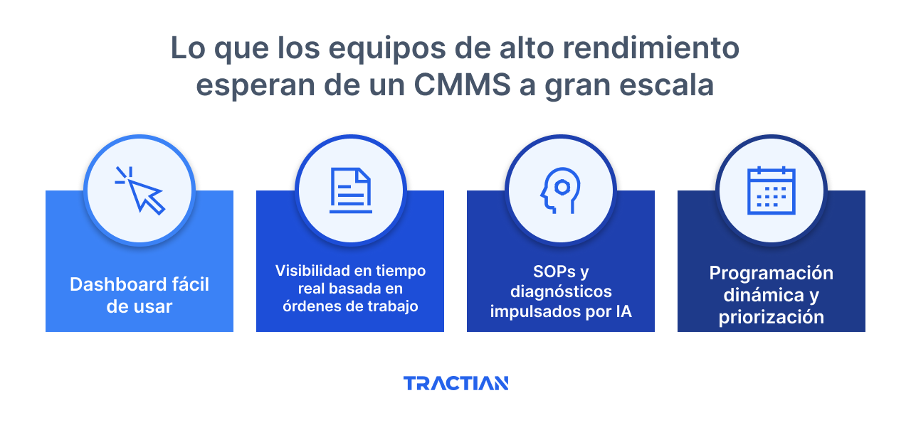 Si apenas inicias tu camino digital o gestionas un solo sitio, nuestra guía de los 3 mejores CMMS para equipos de mantenimiento cubre plataformas más adecuadas para operaciones pequeñas. Pero si tu organización opera a escala empresarial, estos son los no negociables: