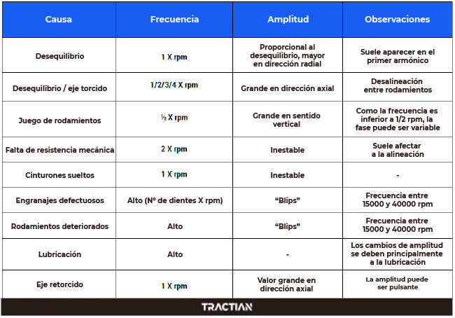 Después de tener una noción de tales aspectos es posible que usted identifique patrones en los diagramas de vibración. Pudiendo señalar posibles problemas con determinadas variaciones de las mismas, con esta información, podemos construir una tabla base para identificar tales vibraciones: