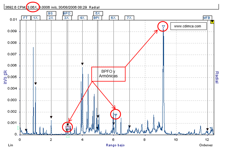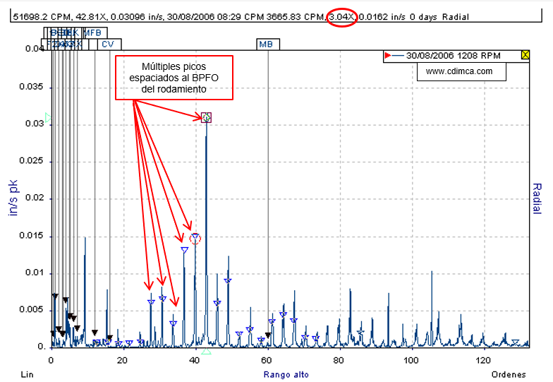Esto se evidencia con el surgimiento de las frecuencias de falla de la pista externa del rodamiento, Ball Pass Frequency Outer Race o Frecuencia de paso de la bola por la pista exterior (BPFO), y sus armónicas de baja frecuencia, por ejemplo: BPFO, 2xBPFO, 3xBPFO y a altas frecuencias múltiples espaciadas al BPFO.