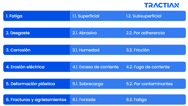 Los rodamientos están sujetos a innumerables modos de falla. Según la norma ISO 15243:2004, existen 6 modos de falla en rodamientos que se los presentamos en el siguiente cuadro: