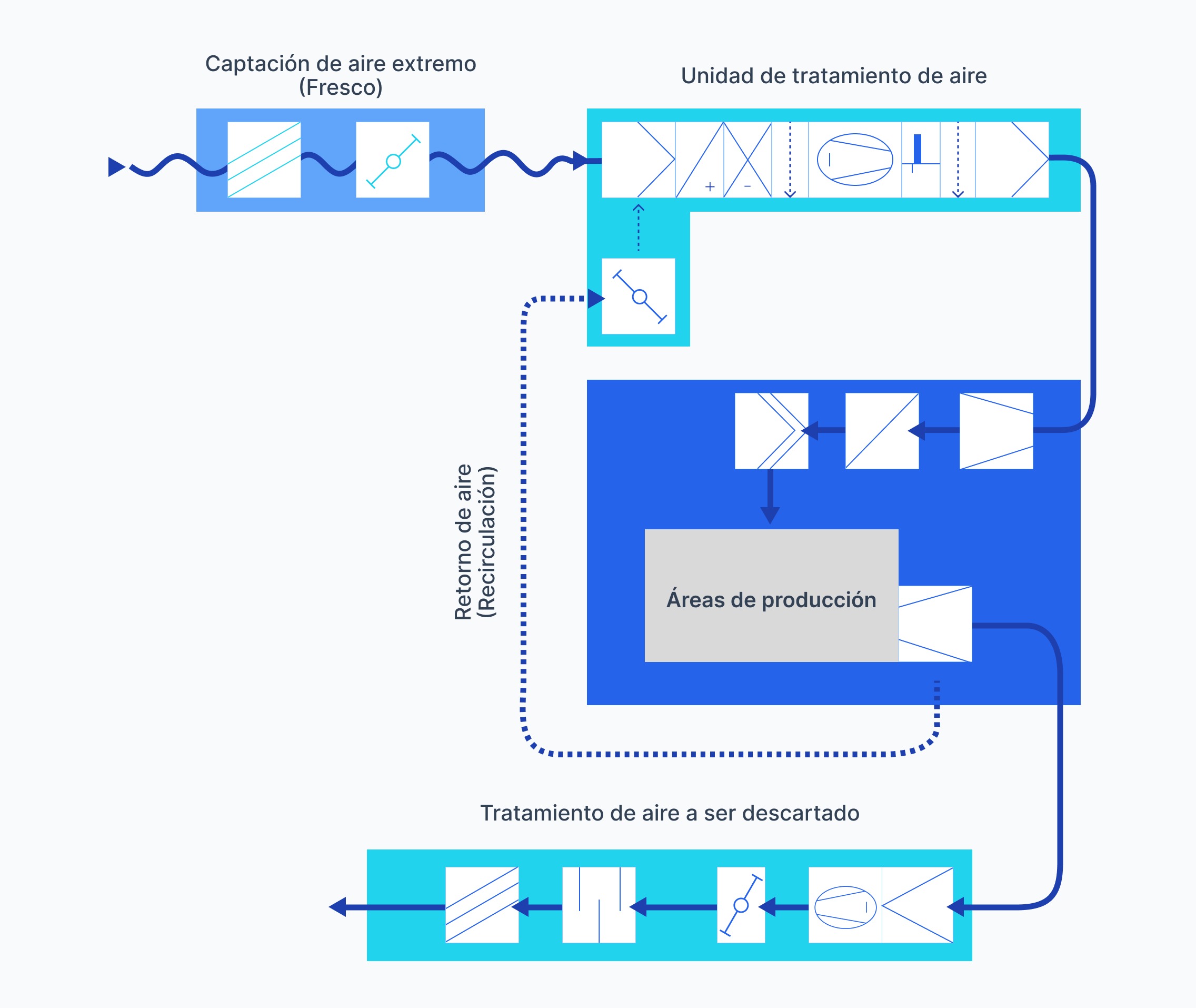 Además, se pueden añadir otros procesos como humidificación, deshumidificación, extracción y generación de vacío. Estos procesos pueden lograrse mediante equipos específicos diseñados para cada necesidad.
