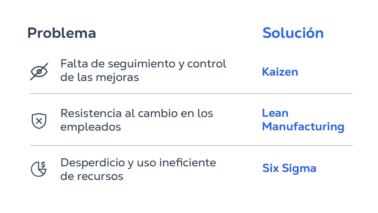La implementación de un plan de mejora continua en una planta de producción puede enfrentar diversos desafíos. A continuación, describimos algunos ejemplos de problemas comunes que pueden surgir, junto con la aplicación de las metodologías mencionadas anteriormente (Kaizen, Lean Manufacturing, y Six Sigma) para resolverlos.