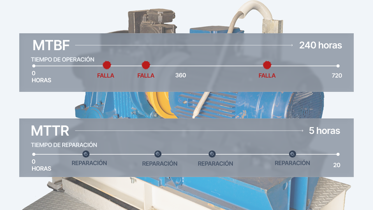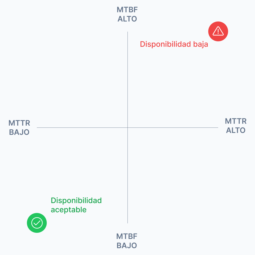 Un activo con MTBF de 200 horas y MTTR de 4 horas tiene una disponibilidad del 98%. El mismo activo con MTTR de 20 horas tiene una disponibilidad del 91%. Esa diferencia del 7% en disponibilidad puede representar cientos de horas de producción perdida al año en una línea crítica.