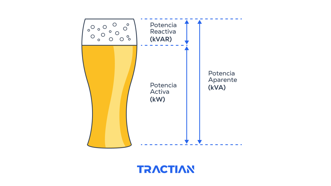 Por ejemplo, usemos de analogía una cerveza: el líquido sería la potencia activa, mientras que la potencia reactiva sería la espuma. La totalidad del vaso representa la potencia aparente, que se define como la suma de ambas.